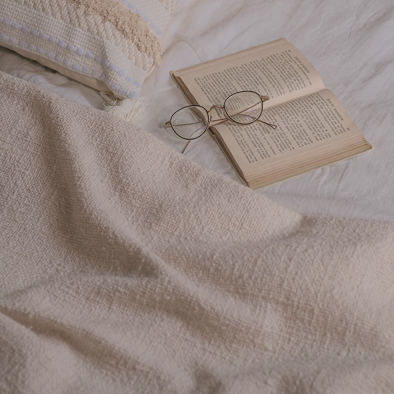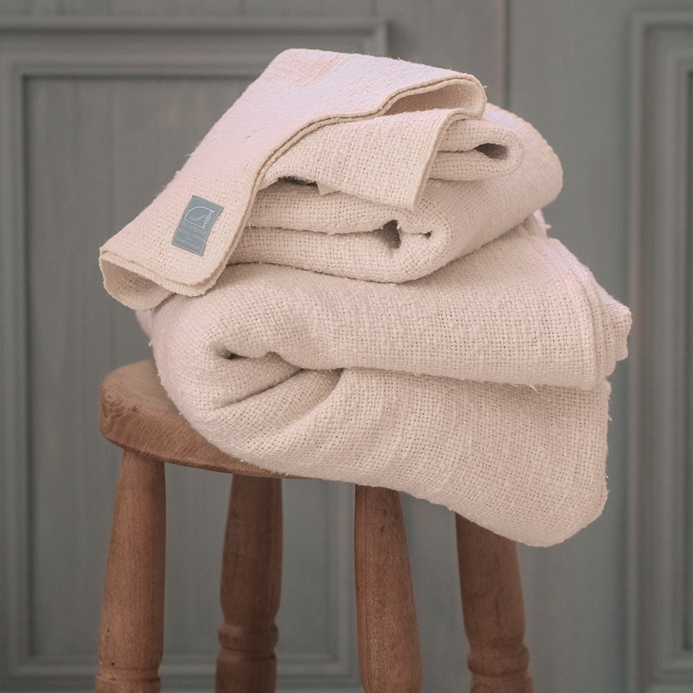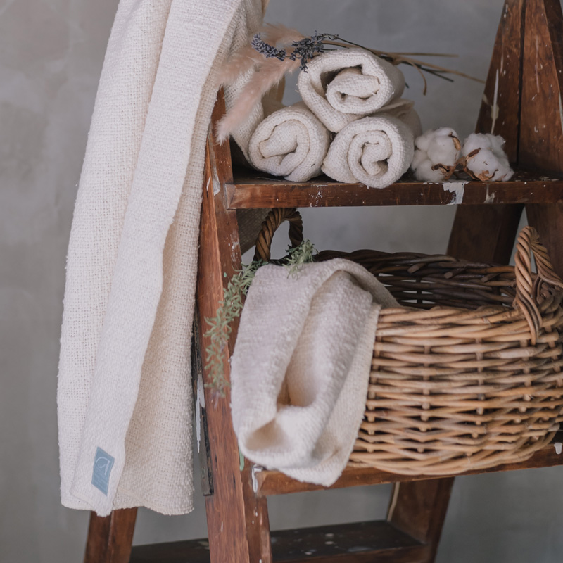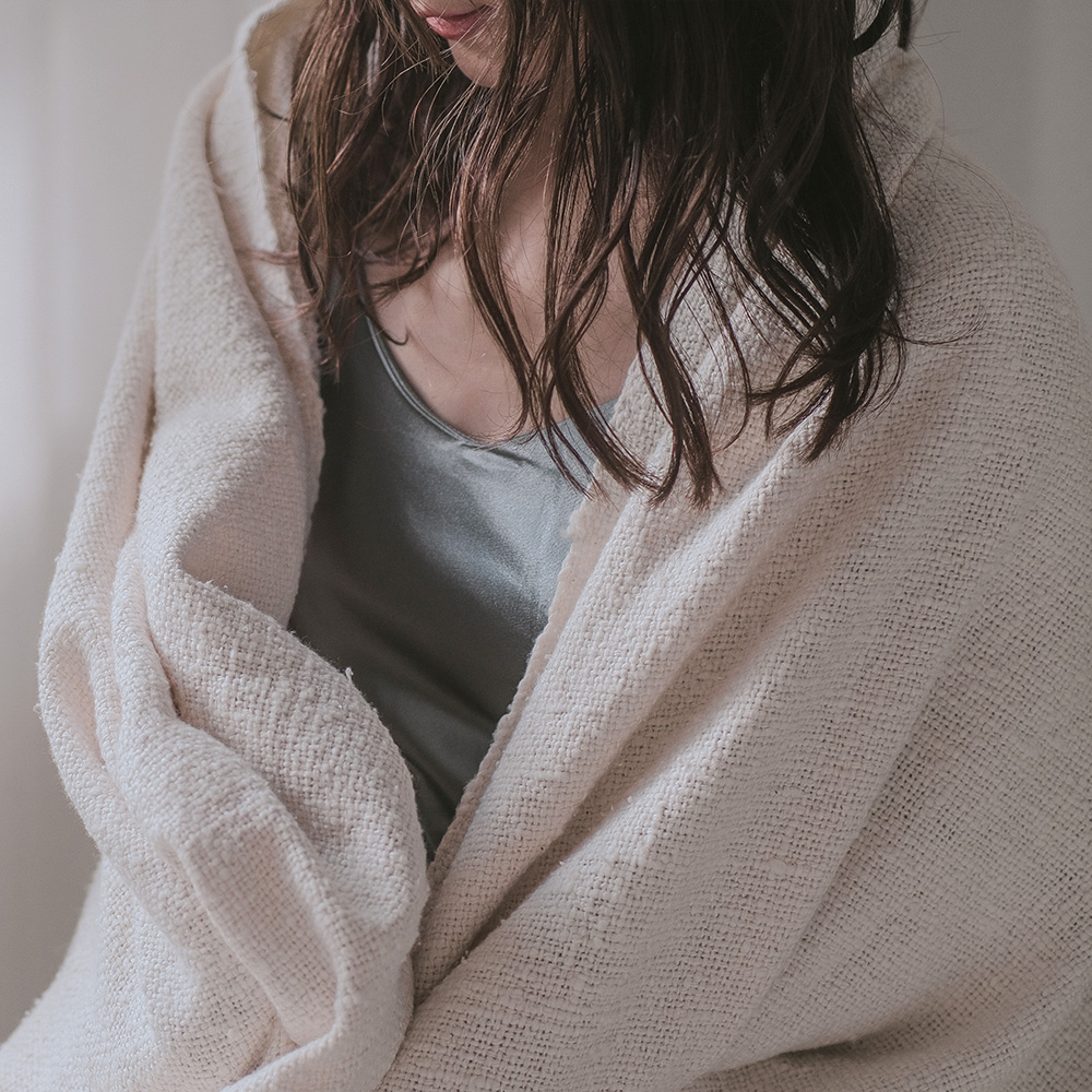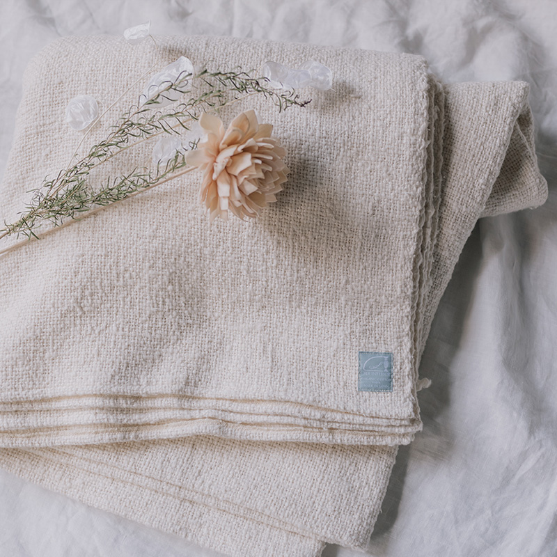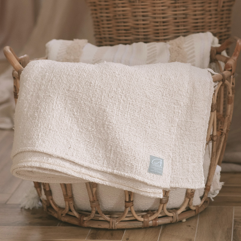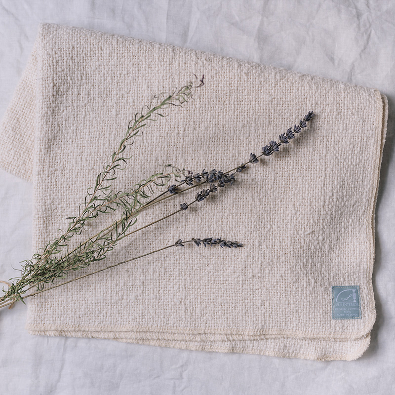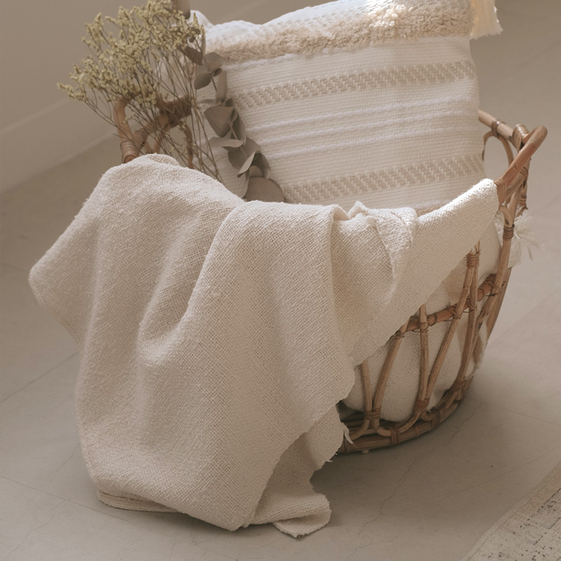 膝にのせるだけでポカポカ。織物なので一般的なブランケットより薄手になります。場所を取らずクルンと丸めてリビングの一角に。